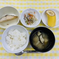 野菜粥・さつま芋の甘煮・野菜スープ豚丼・さつま芋のレモン煮・わかめスープ(キャベツ)・みかん缶…
