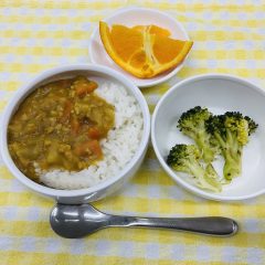 7倍粥・野菜そぼろ・蒸しさつまいも・すまし汁・オレンジ
