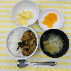 軟飯・かじきのさっぱり甘酢ソース・かぼちゃサラダ・豚汁・レアチーズ