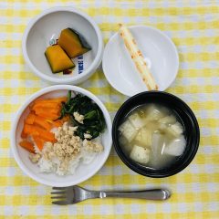 全粥・豆腐のあんかけ・野菜のつぶし・じゃがいものスープ御飯・マーボー豆腐・ほうれん草のナムル・…