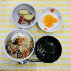 御飯・メンチカツ・茄子の梅和え・みそ汁(じゃがいも・あげ)・オレンジ