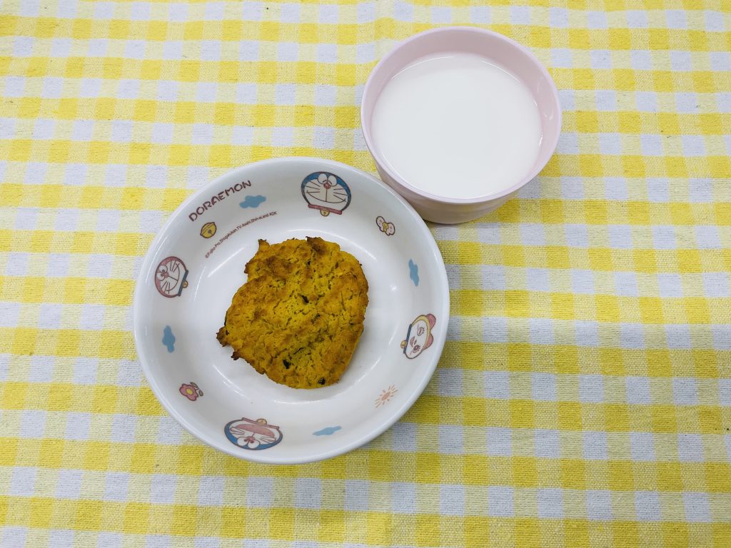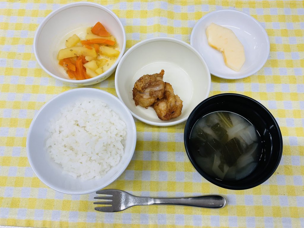 御飯・鶏のから揚げ・じゃがいもきんぴら(ごま)・みそ汁(チンゲン菜・玉ねぎ)・りんご