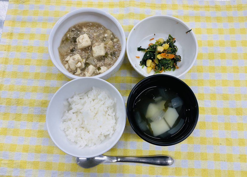 御飯・マーボー豆腐・ほうれん草のナムル・じゃがいものスープ