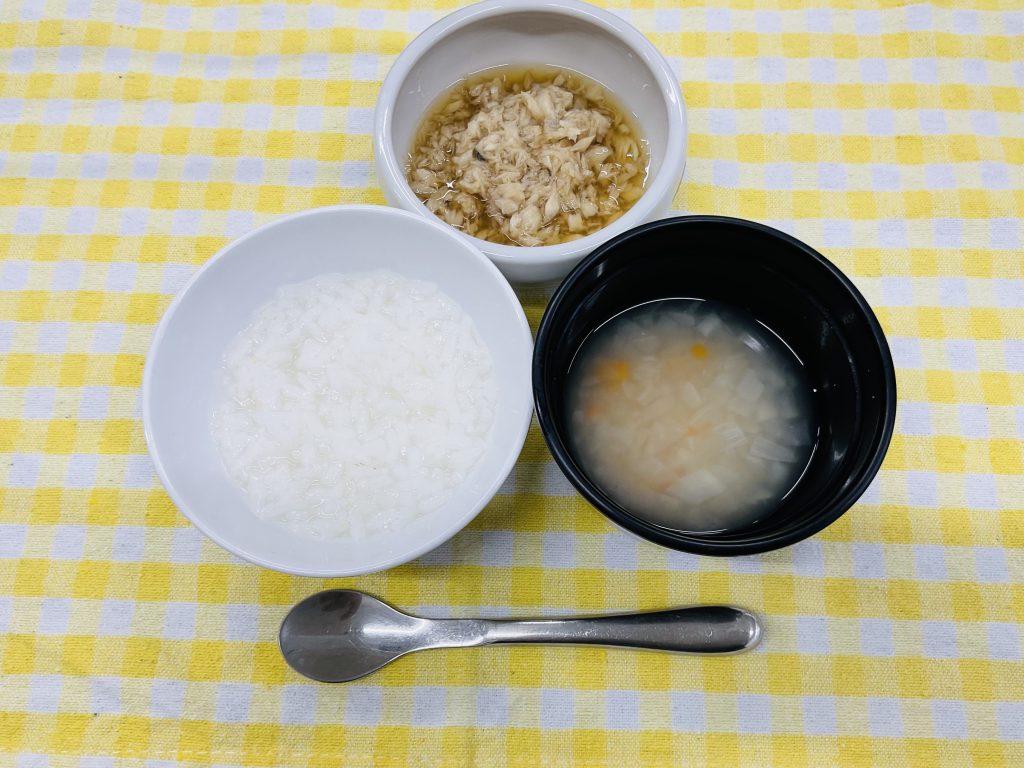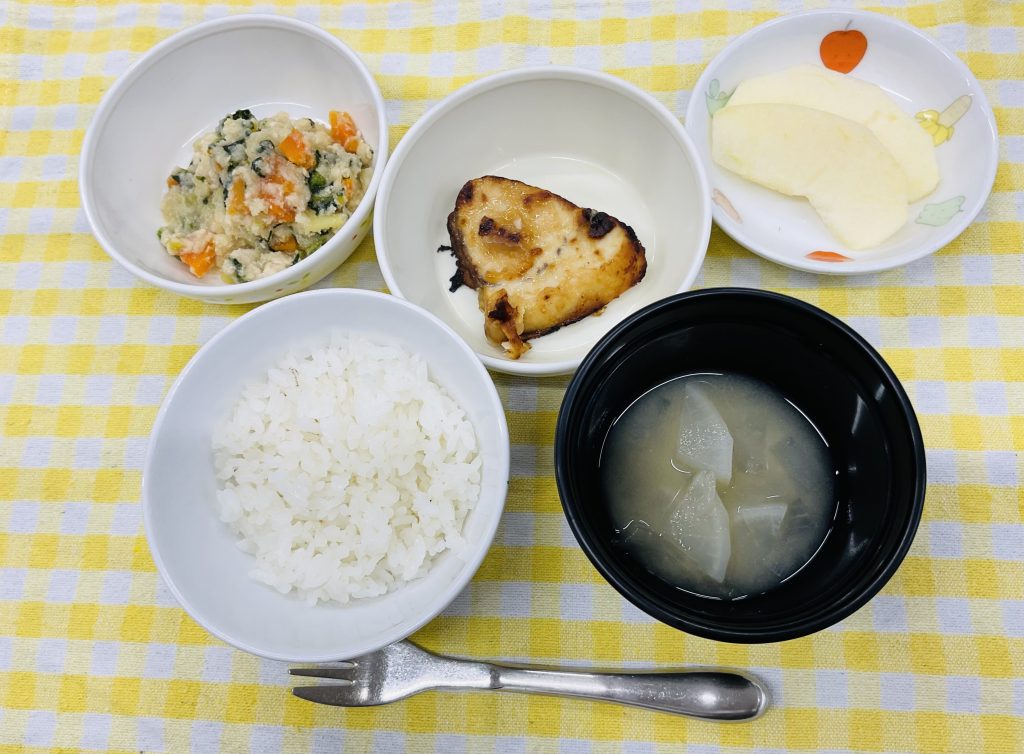 御飯・かじきの竜田揚げ・卯の花(人参・鶏ひき肉)・みそ汁(だいこん)・りんご