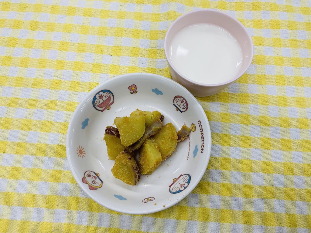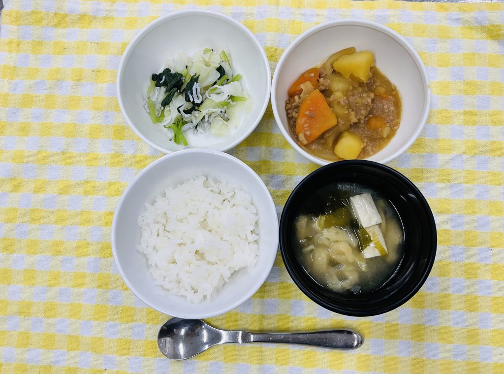 御飯・肉じゃが(豚肉)・小松菜のしらすサラダ(キャベツ)・豆腐みそ汁(わかめ)