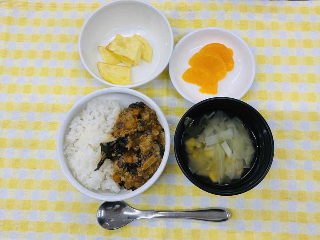 ドライカレーライス(青菜)・ベイクドじゃが・スープ(キャベツ・コーン)・みかん缶