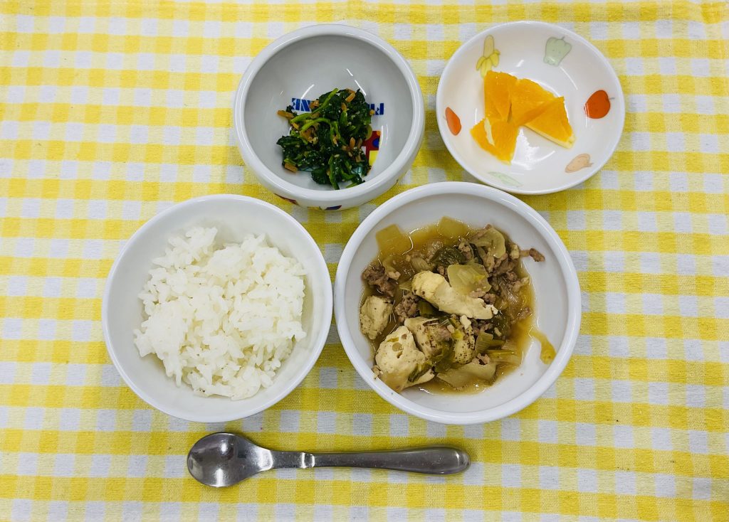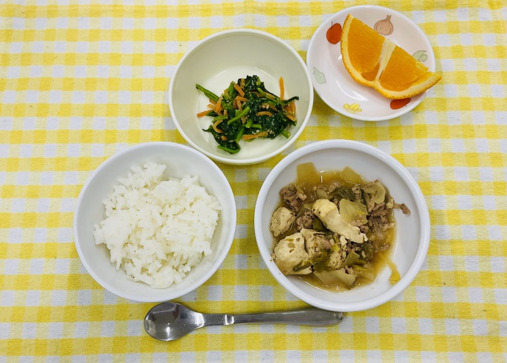 御飯・肉豆腐・ほうれん草のナムル(ごま)・オレンジ