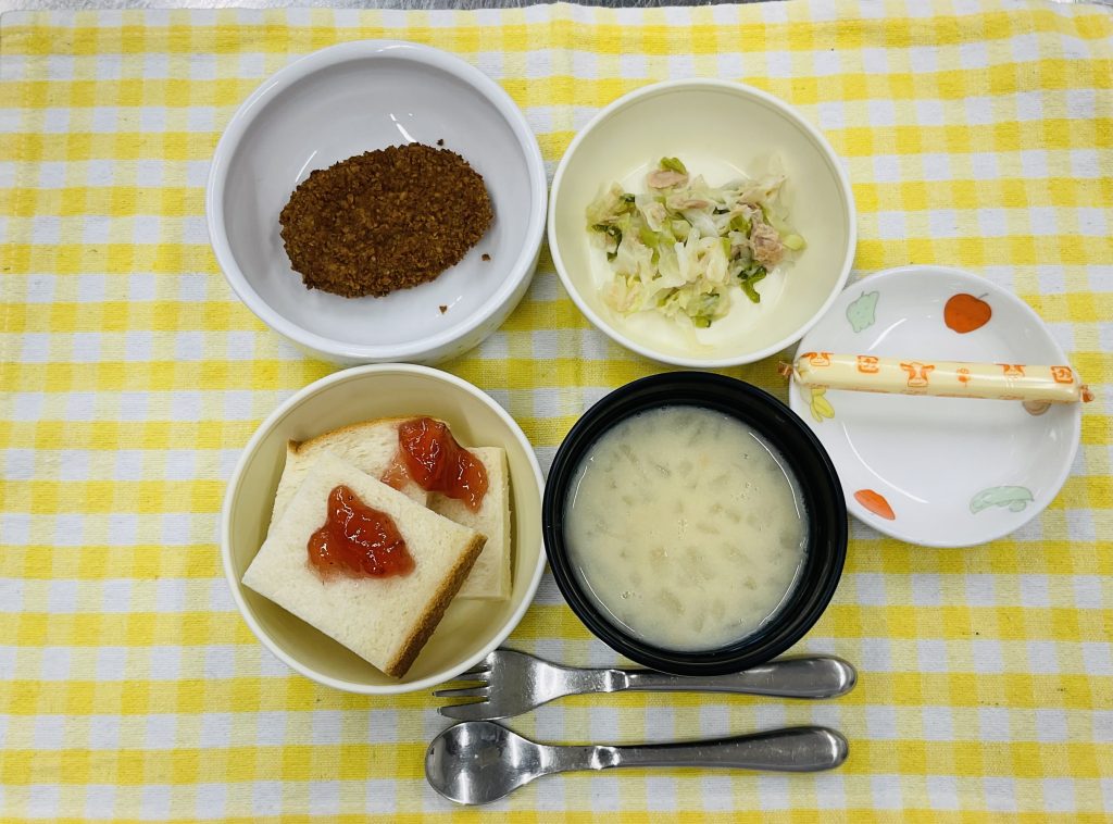 食パン(イチゴジャム)・キャベツのメンチカツ・キャベツとツナのサラダ・
