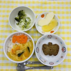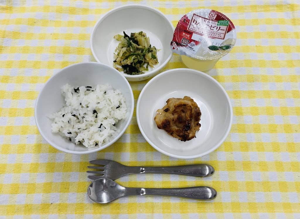 わかめ御飯・鶏肉のマーマレード焼き・キャベツとほうれん草のおかか和え・フルーツゼリー