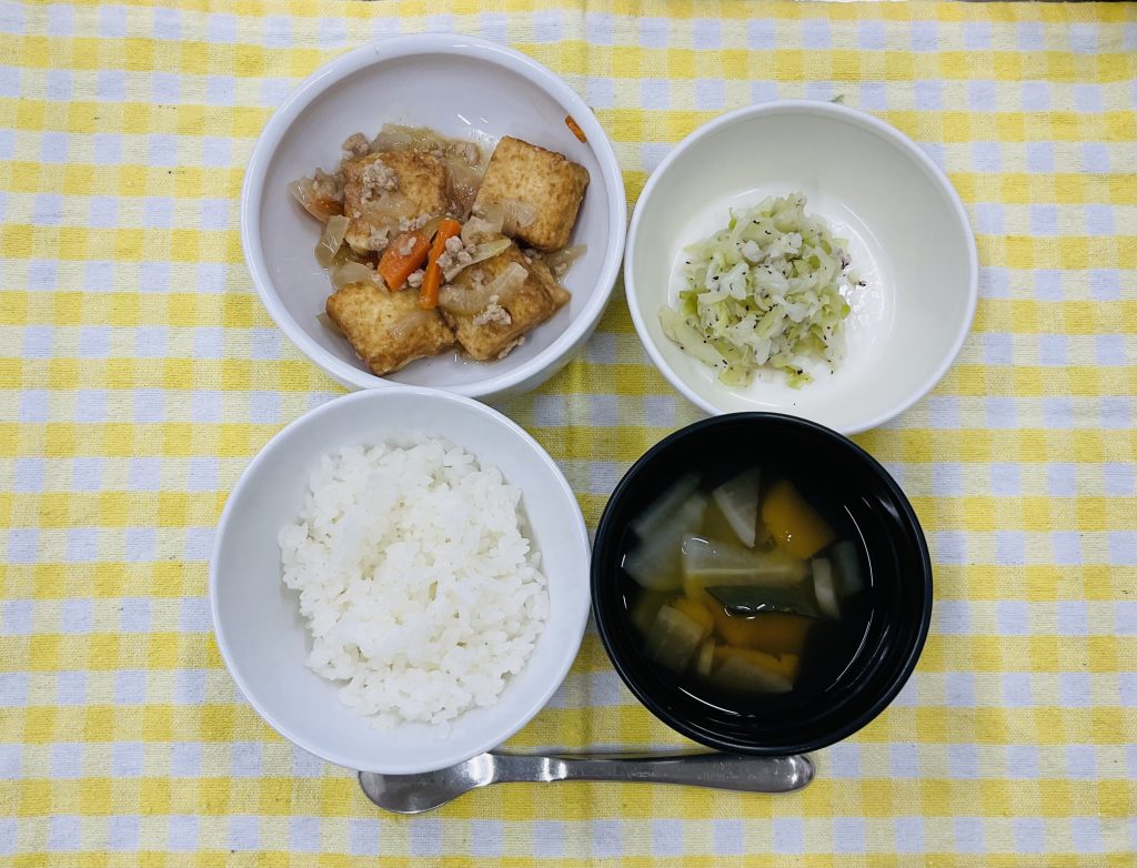 御飯・厚揚げと豚肉の味噌煮・キャベツのゆかり和え・すまし汁(大根・かぼちゃ)