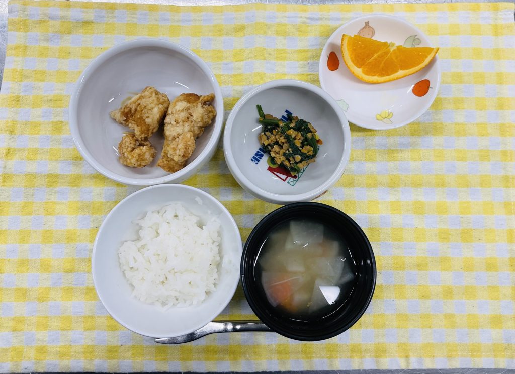 御飯・ささみのレモン煮・納豆和え(ほうれん草)・みそ汁(大根・人参)・ オレンジ