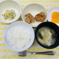 ピラフ(ツナ・カレー)・クリームシチュー(米粉) ブロッコリーのごま和え・みかん缶