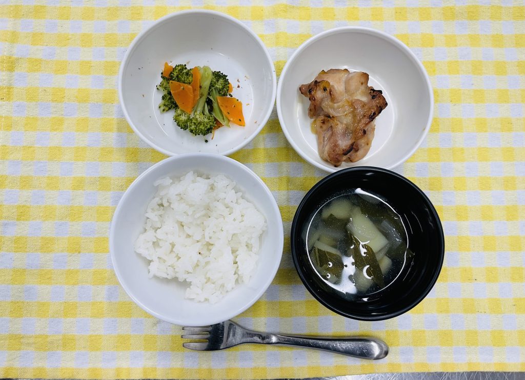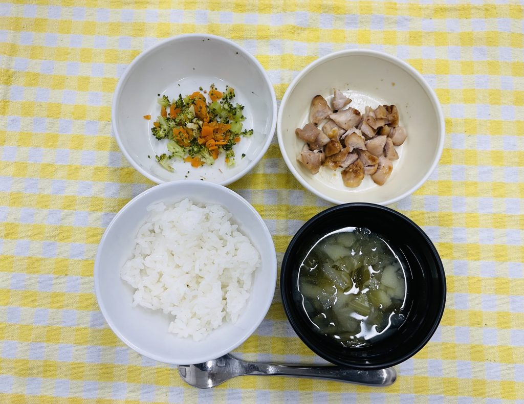 御飯・鶏肉のマーマレード焼き・ブロッコリーのおかか和え(にんじん)・じゃがいものスープ