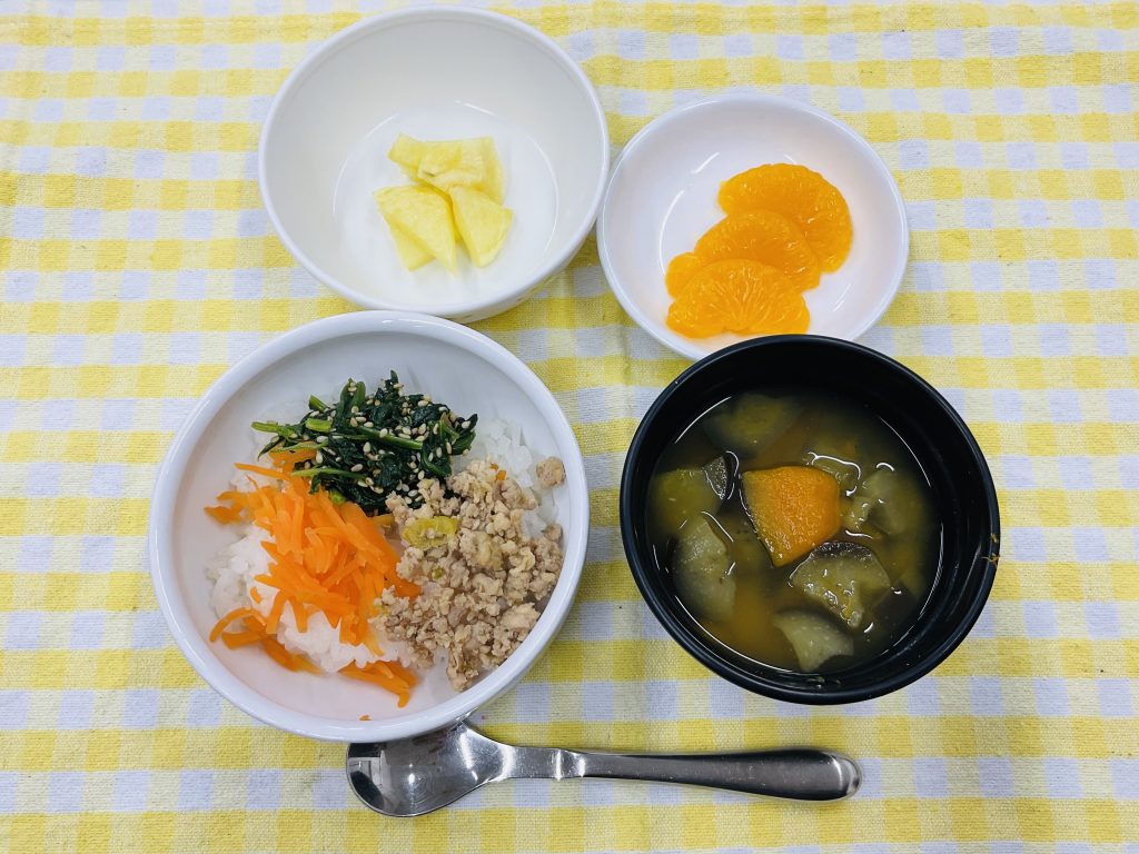 キッズビビンバ・ベイクドじゃが・みそ汁(かぼちゃ・なす)・みかん缶