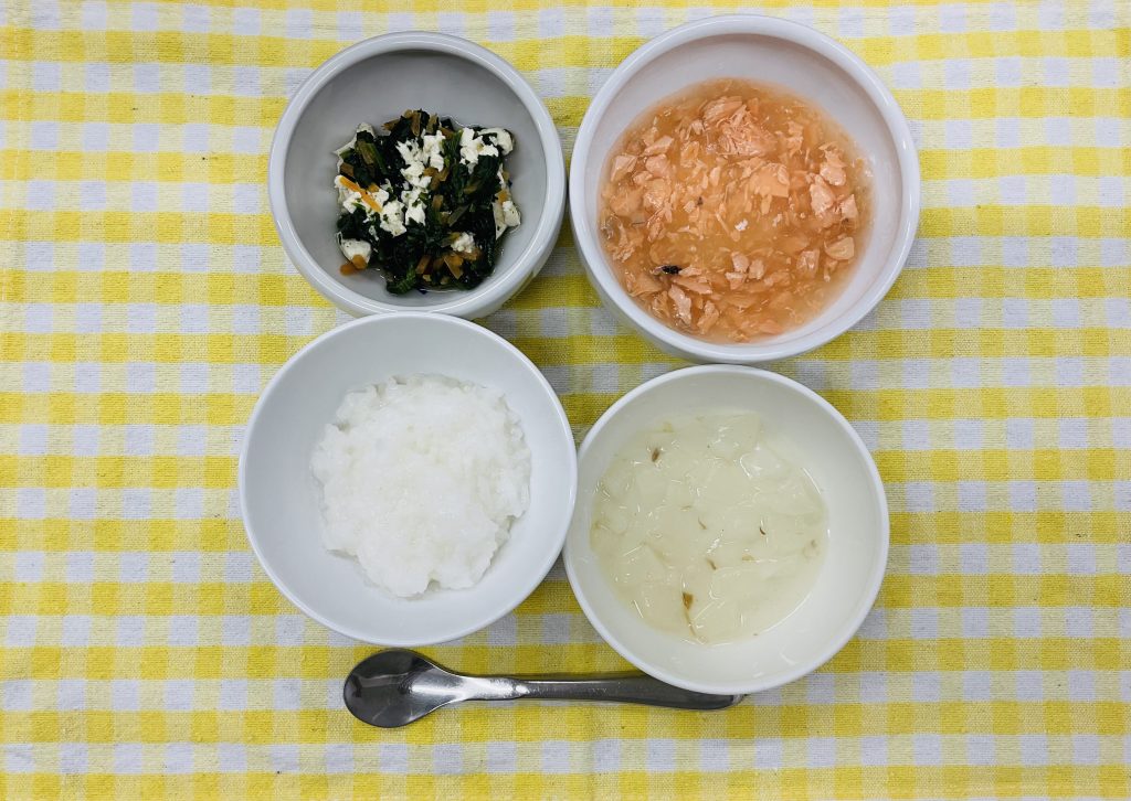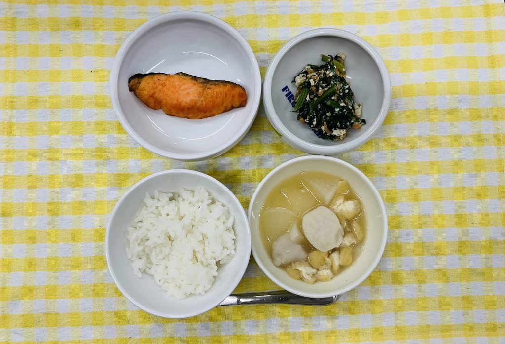 御飯・鮭の塩焼き・白和え(ほうれん草・にんじん・ごま) 大根とあげの煮物風汁