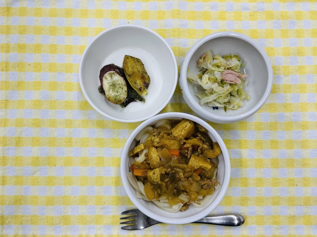 カレーうどん・さつま芋の磯辺揚げ(米粉)・キャベツのサラダ(ツナ)