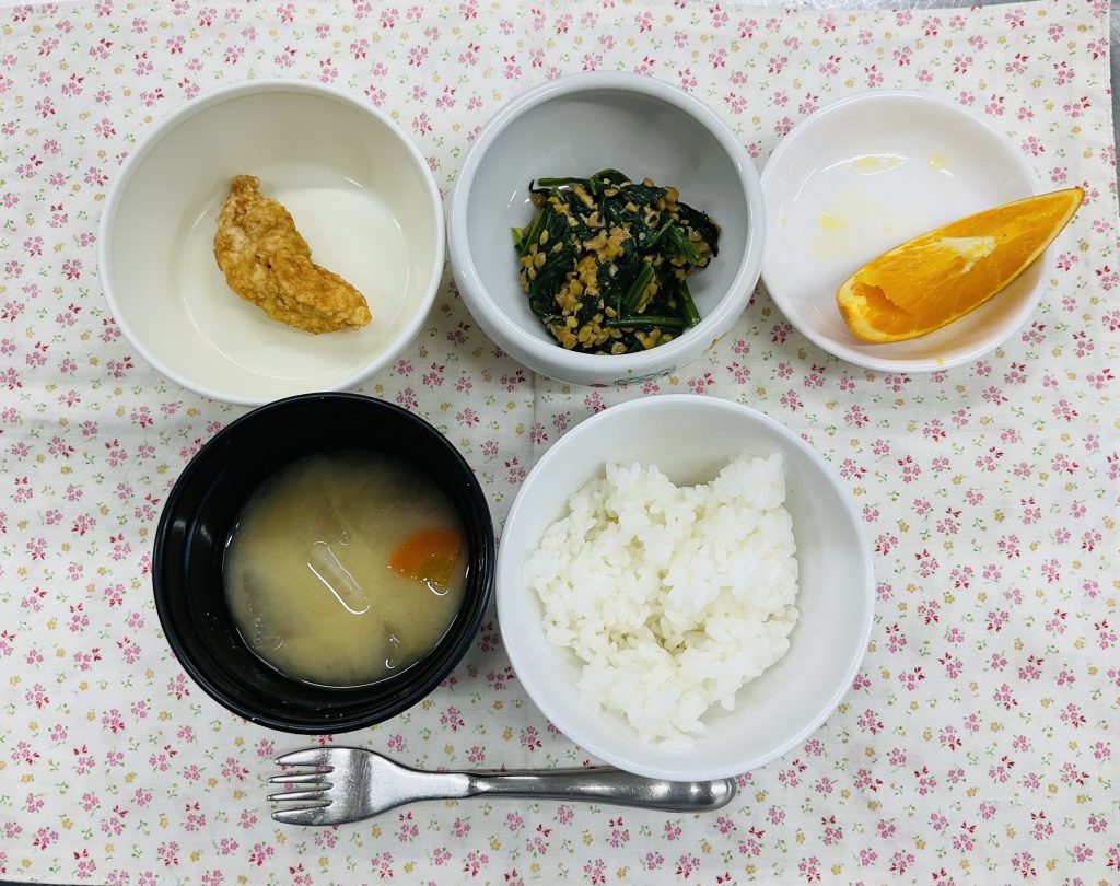 御飯・ささみのレモン煮・納豆和え・みそ汁・オレンジ