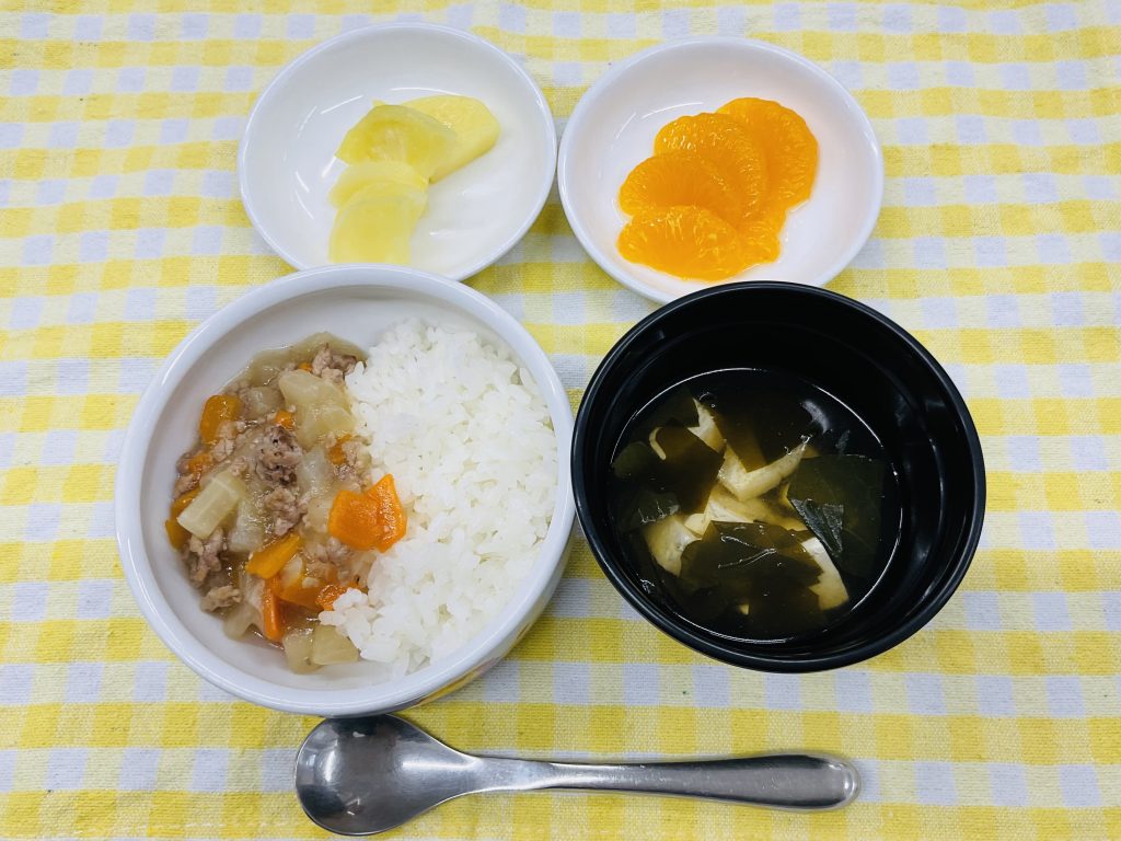 大根のそぼろ丼・ベイクドじゃが・豆腐のすまし汁・みかん缶