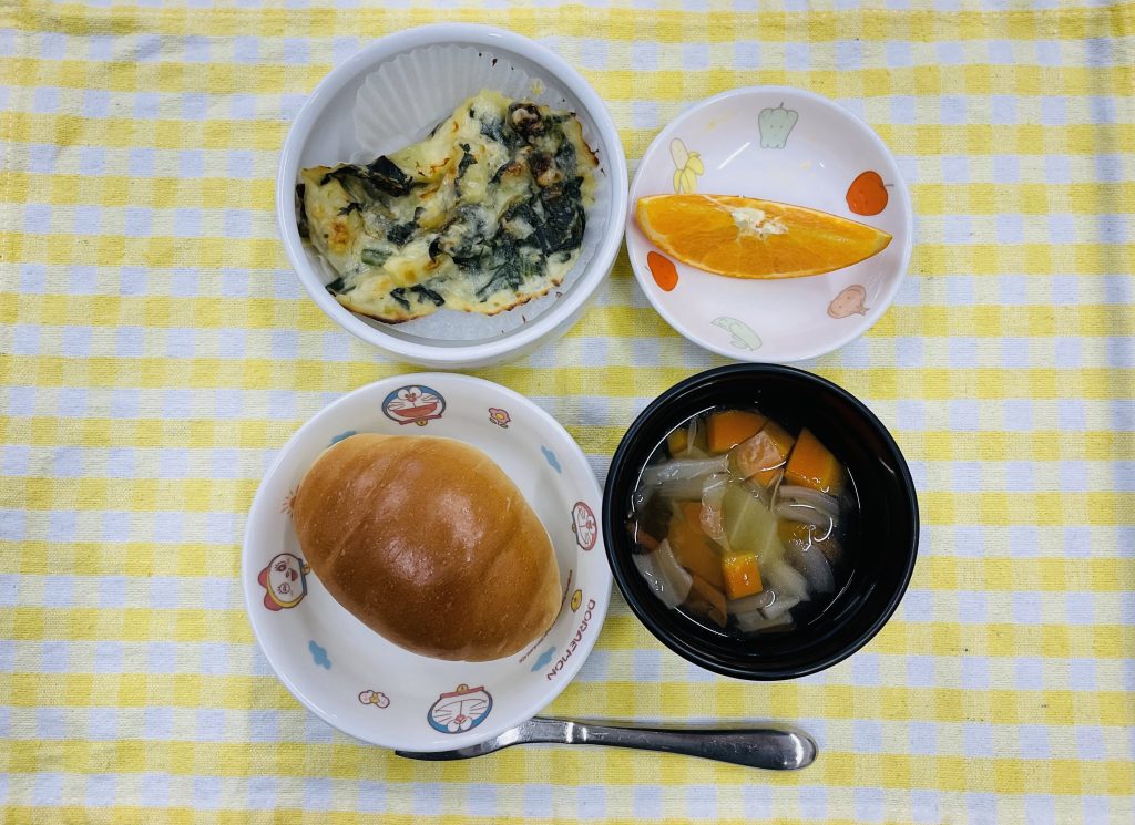 ロールパン・ほうれん草のグラタン・野菜のスープ・オレンジ