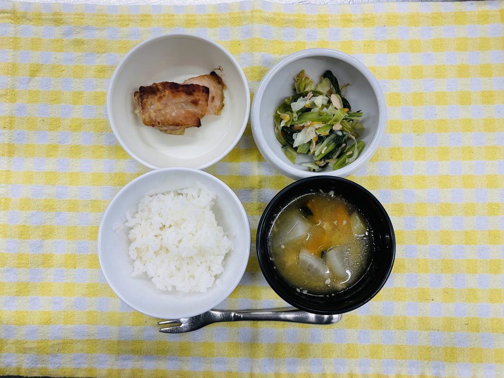 御飯・鶏肉のマーマレード焼き・小松菜のツナサラダ(キャベツ)・豚汁(かぼちゃ)