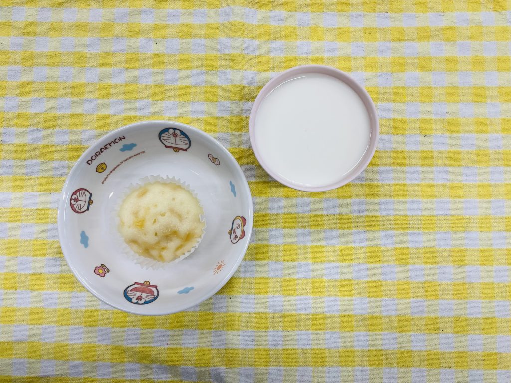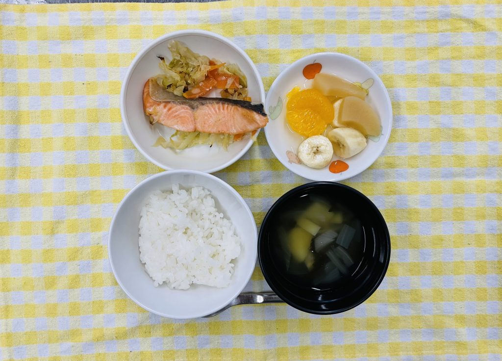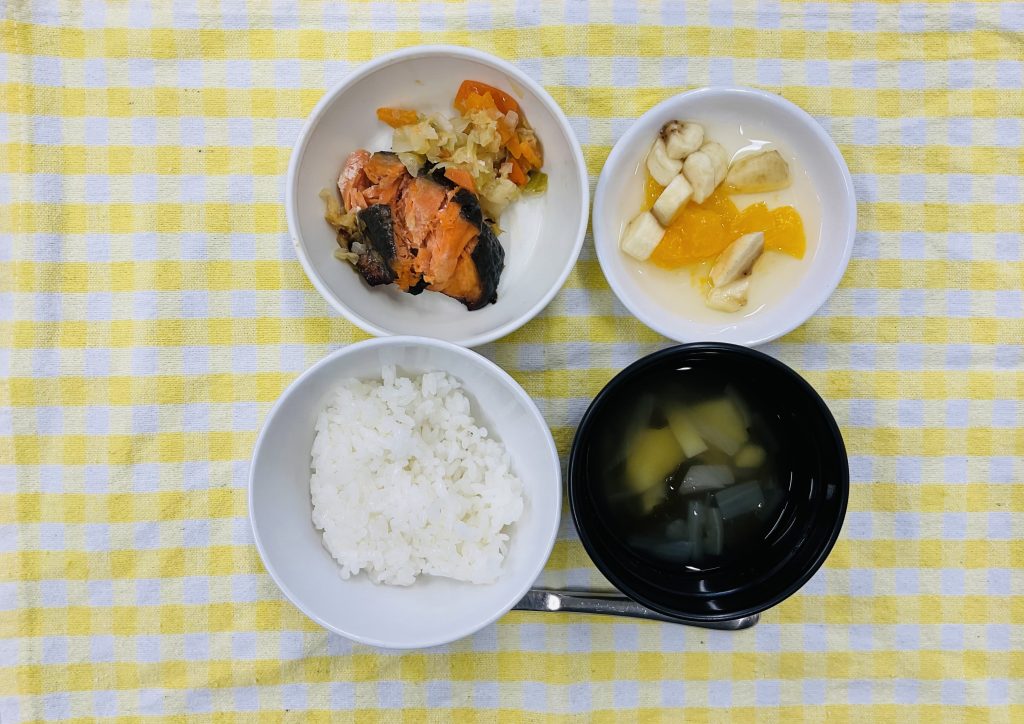 御飯・しゃけのちゃんちゃん焼き・すまし汁(じゃが芋・玉ねぎ)・フルーツカクテル(バナナ・みかん缶)