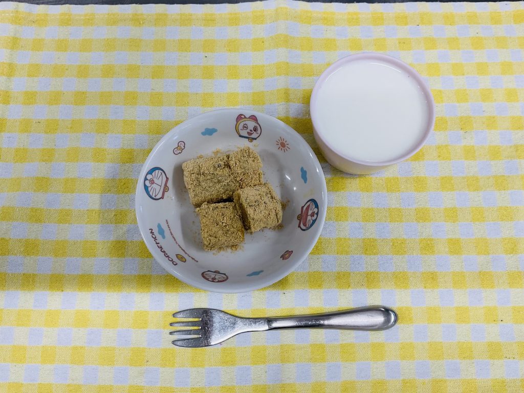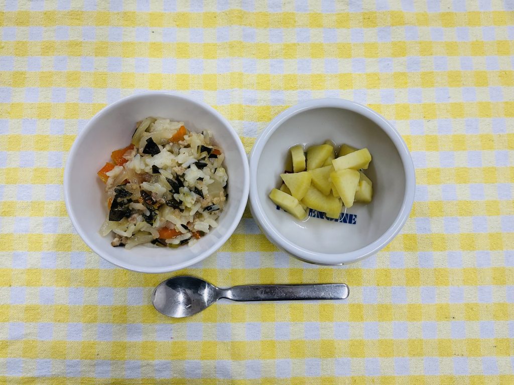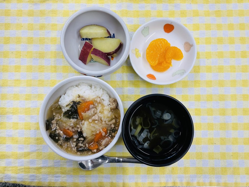 豚丼・さつま芋のレモン煮・わかめスープ・みかん缶