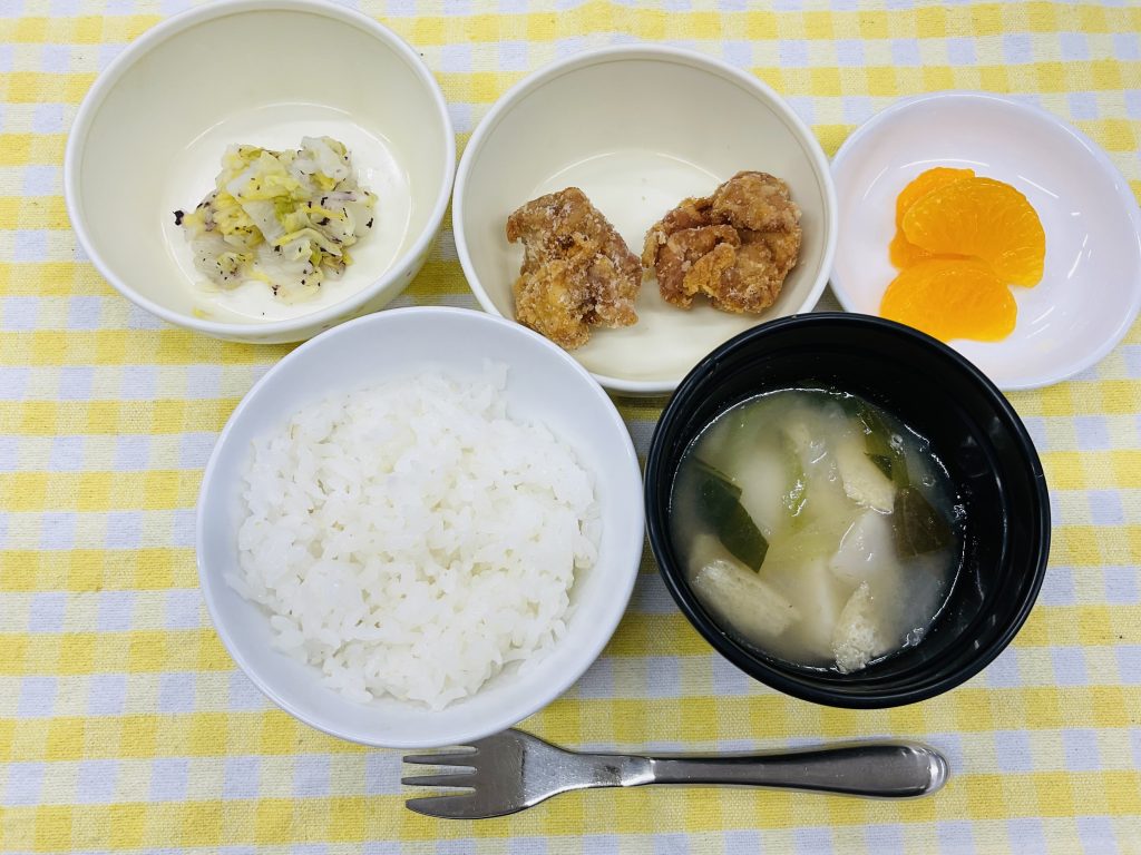 御飯・鶏のから揚げ・白菜のゆかり和え・味噌汁・みかん缶