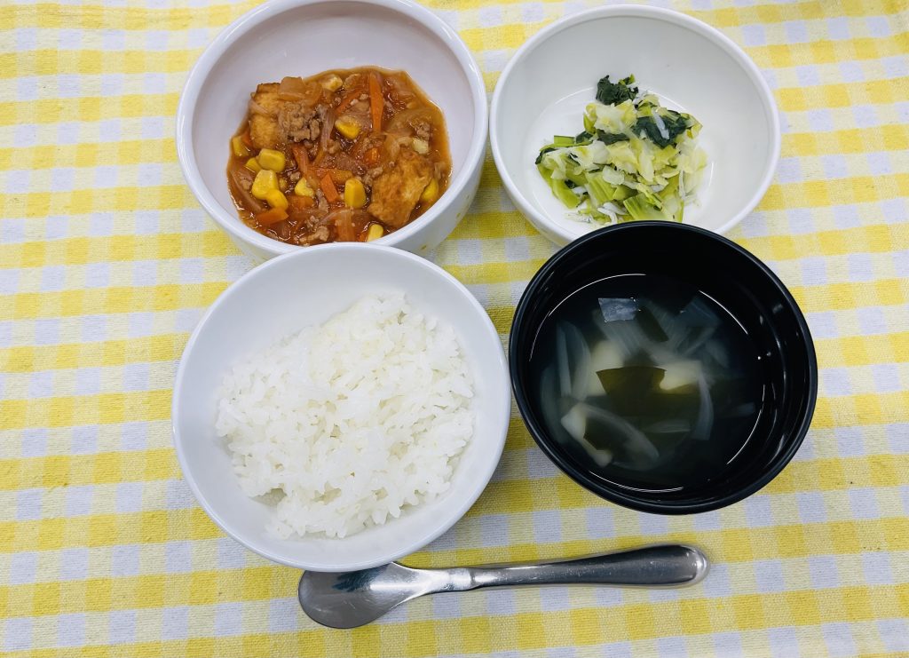 御飯・厚揚げのケチャップ煮・小松菜のしらすサラダ・わかめスープ