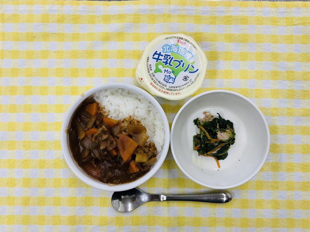 ハヤシライス・ほうれん草のツナ和え・牛乳プリン