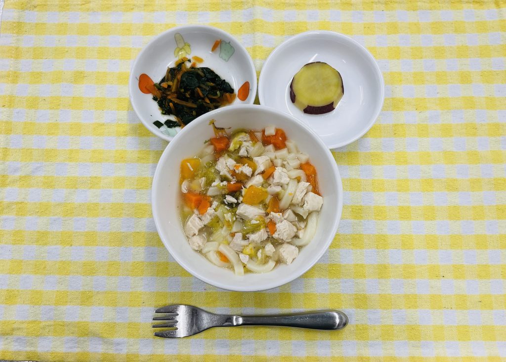 味噌煮込みうどん・さつま芋の甘煮・ほうれん草の和えもの