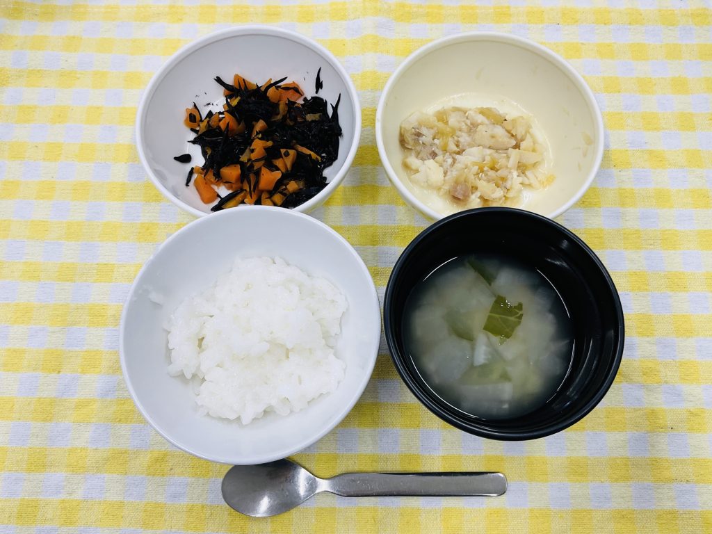 全粥・白身魚の包み焼き・ひじきの煮物・みそ汁