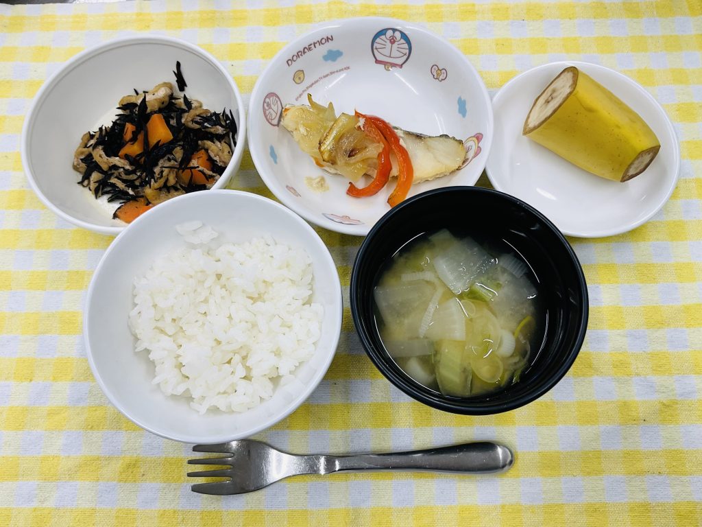 御飯・白身魚の包み焼き・ひじきの煮物・みそ汁・バナナ