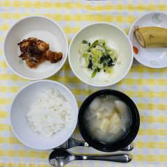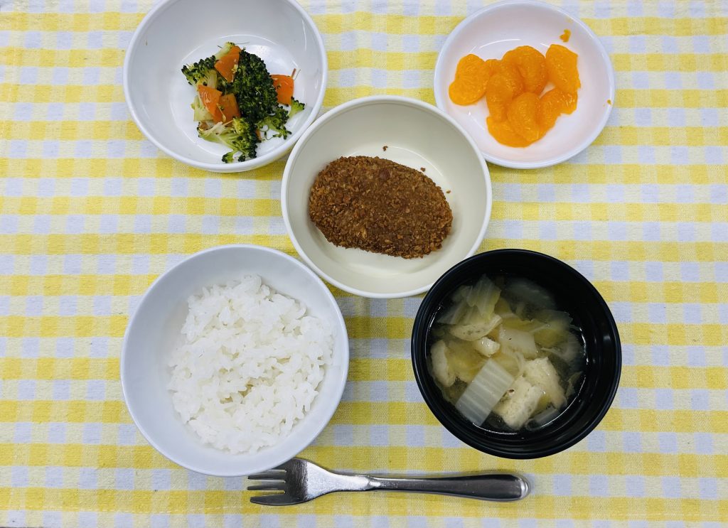 御飯・キャベツのメンチカツ・ブロッコリーの和え物・すまし汁・みかん缶