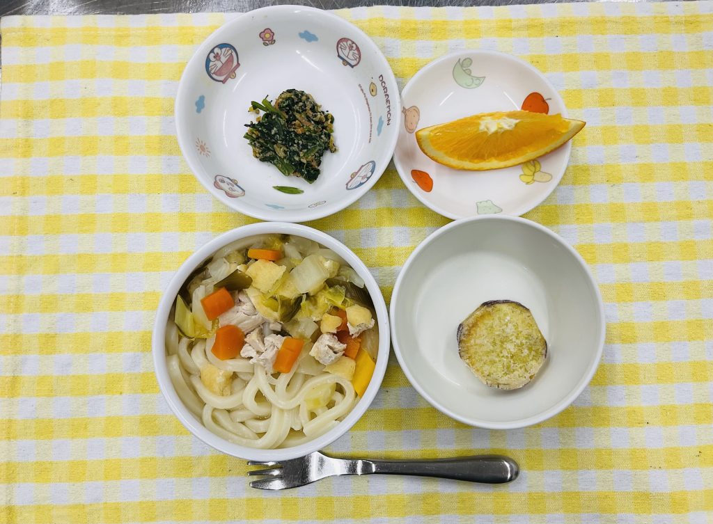 味噌煮込みうどん・さつま芋のさくさく揚げ・ほうれん草のごま和え・オレンジ
