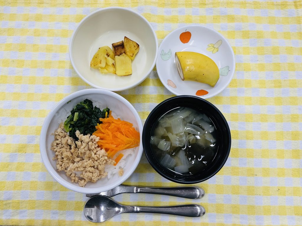 三色どんぶり・ベイクドじゃがいも・みそ汁・バナナ