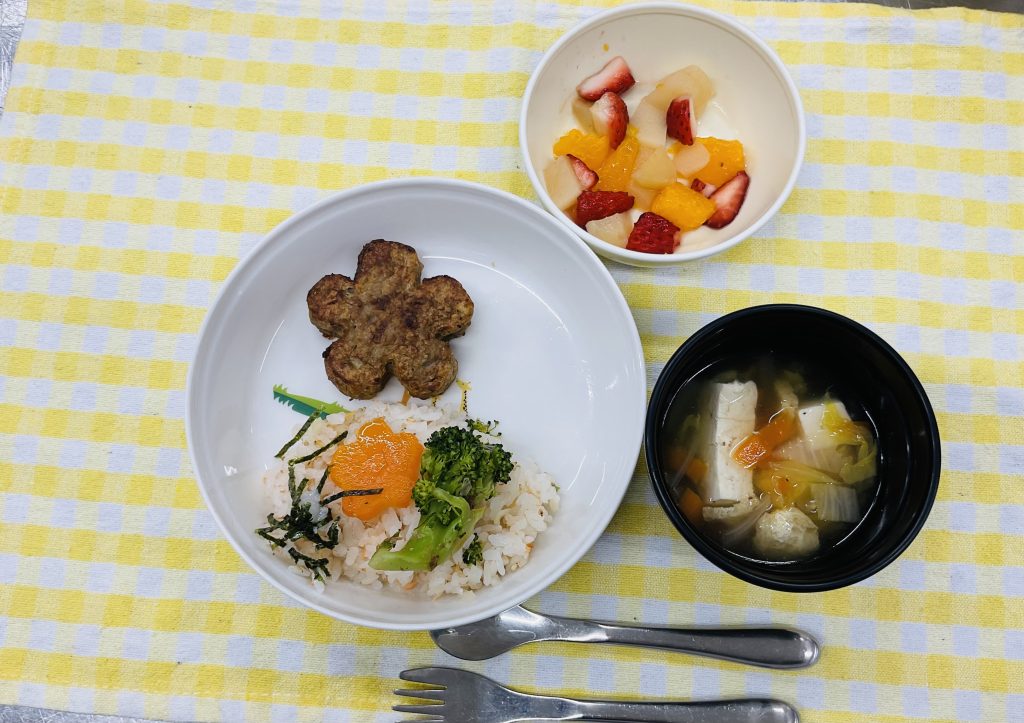 軟飯・ハンバーグ・雛祭り花形にんじんの甘煮・すまし汁・フルーツカクテル