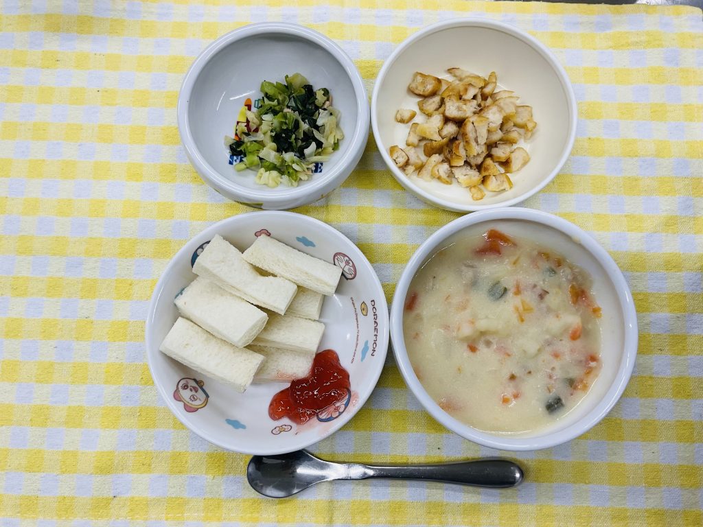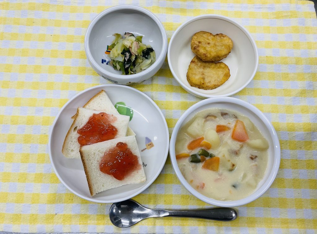 食パン(いちごジャム)・クリームシチュー・チキンナゲット・小松菜のツナ酢和え