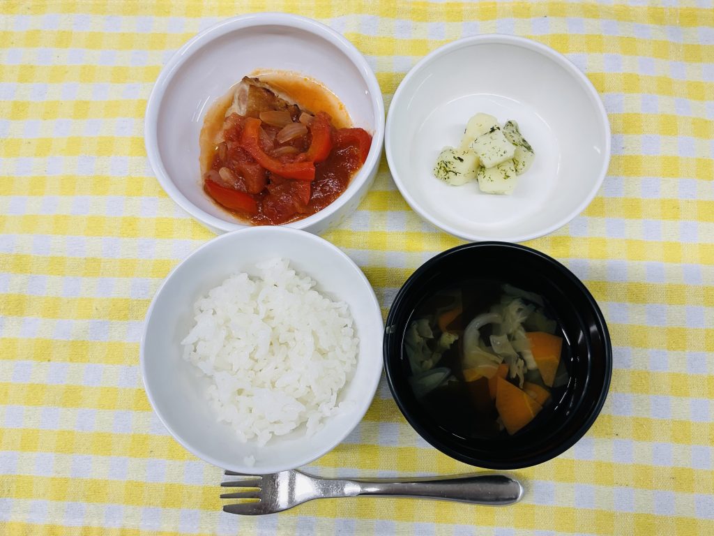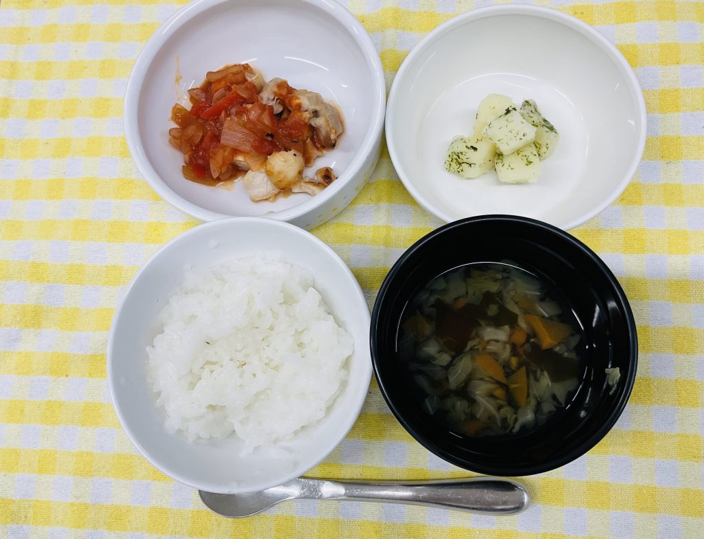 御飯・鶏肉のトマトソース煮・粉ふき芋・わかめスープ