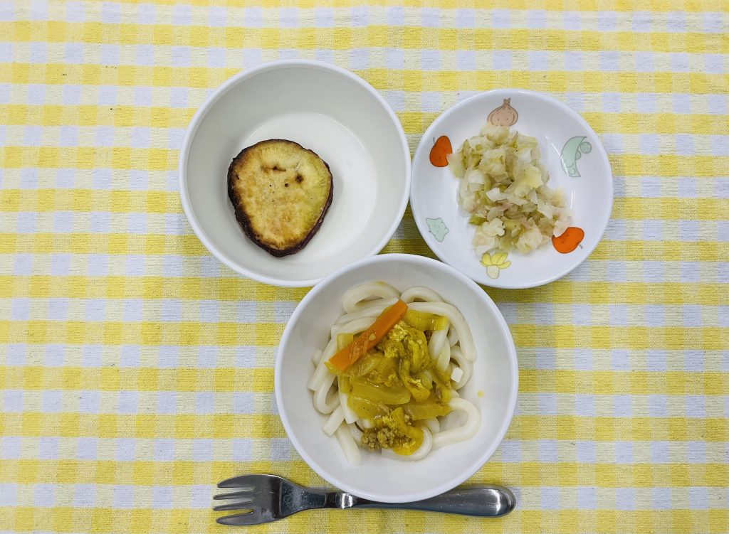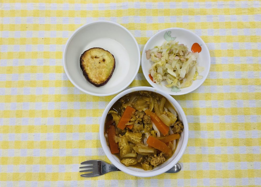 カレーうどん・さつま芋のさくさくあげ・キャベツのサラダ(ツナ)