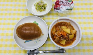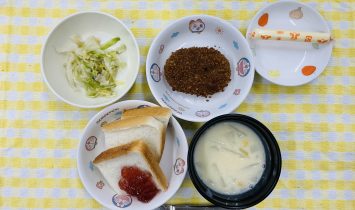 スティック食パン・キャベツのツナ煮・野菜スープ食パン(いちごジャム)・キャベツメンチカツ・キャベツとツナのサラダ・コーンスープ・チーズ(棒)牛乳・1歳からのサッポロポテト…