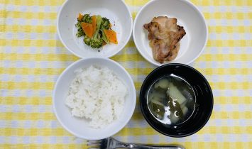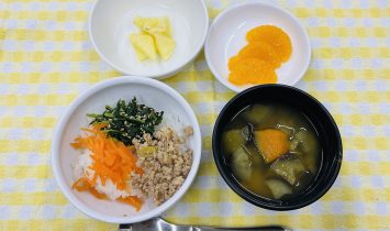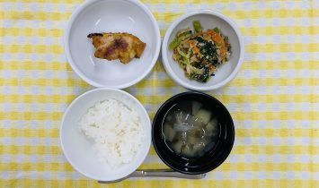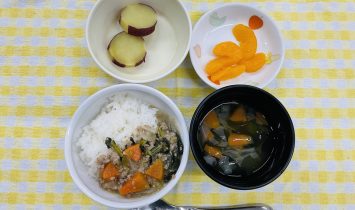 全粥・ささみのほぐし・小松菜のとろみ煮・みそ汁御飯・タンドリーチキン・小松菜のごま和え(ツナ)・みそ汁(なす・玉ねぎ)牛乳・きな粉ポテト…