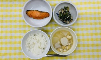 全粥・鮭のほぐし・白和え・大根汁御飯・鮭の塩焼き・白和え(ほうれん草・にんじん・ごま) 大根とあげの煮物風汁牛乳・ホットケーキ…