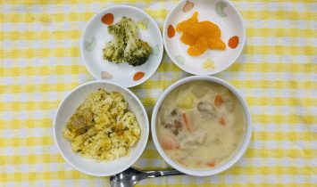 御飯・鶏肉のマーマレード焼き・ブロッコリーのおかか和え(にんじん)・じゃがいものスープ御飯・鶏肉のマーマレード焼き・ブロッコリーのおかか和え(にんじん)・じゃがいものスープ野菜もち(かぼちゃ)・牛乳…