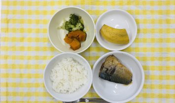 全粥・さわらのほぐし・かぼちゃとブロッコリーの和風あん御飯・さばのみそ煮・かぼちゃとブロッコリーの和風あん・バナナコーンスナック・牛乳…