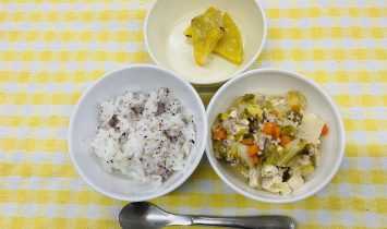 野菜粥・さつま芋の甘煮・野菜スープ豚丼・さつま芋のレモン煮・わかめスープ(キャベツ)・みかん缶牛乳・おはぎ…