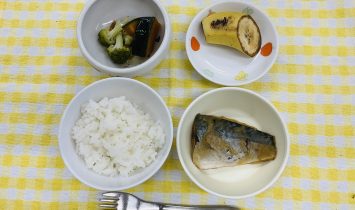 御飯・さばの味噌煮・かぼちゃとブロッコリーの和風あん・バナナ御飯・さばの味噌煮・かぼちゃとブロッコリーの和風あん・バナナキラキラコーンのお星さま・牛乳…