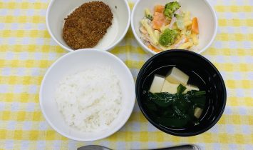 御飯・キャベツのメンチカツ・マカロニサラダ・豆腐すまし汁(ほうれん草)御飯・キャベツのメンチカツ・マカロニサラダ・豆腐すまし汁(ほうれん草)蒸し芋・牛乳…