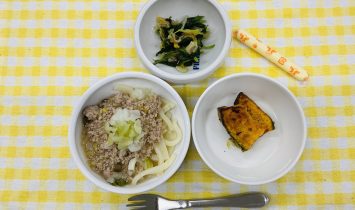 煮込みうどん・白菜とほうれん草のおかか和え・かぼちゃの天ぷら・チーズジャージャーうどん・白菜とほうれん草のおかか和え・かぼちゃの天ぷら チーズ(棒)おやつビビンバ・牛乳…