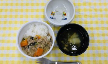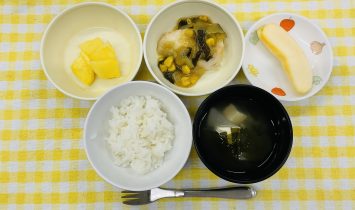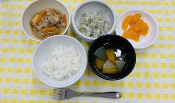 ひじきごはん(ツナ)・豆腐旨煮椀(キャベツ)・さつま芋のりんご煮ひじきごはん(ツナ)・豆腐旨煮椀(キャベツ)・さつま芋のりんご煮野菜もち(かぼちゃ)・牛乳…