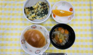 パン粥・根菜煮・野菜のスープロールパン・ほうれん草のグラタン・野菜のスープ・オレンジ牛乳・しらす,ネギ御飯…